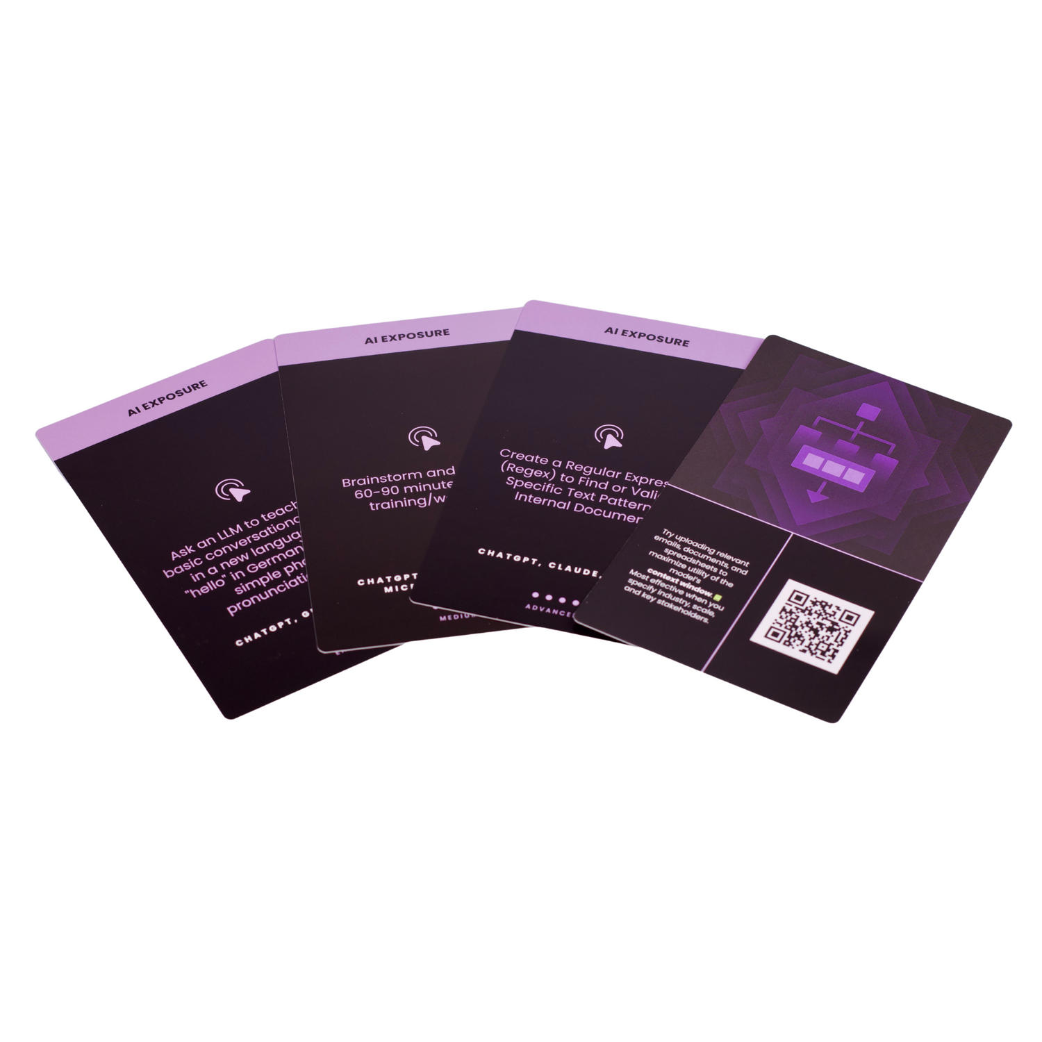 - Exposure Cards: A selection of hands-on AI tasks progressing from beginner to advanced - everything from having AI write emails to analyzing data or building web apps. For each one, more information is available via the QR code on the card.