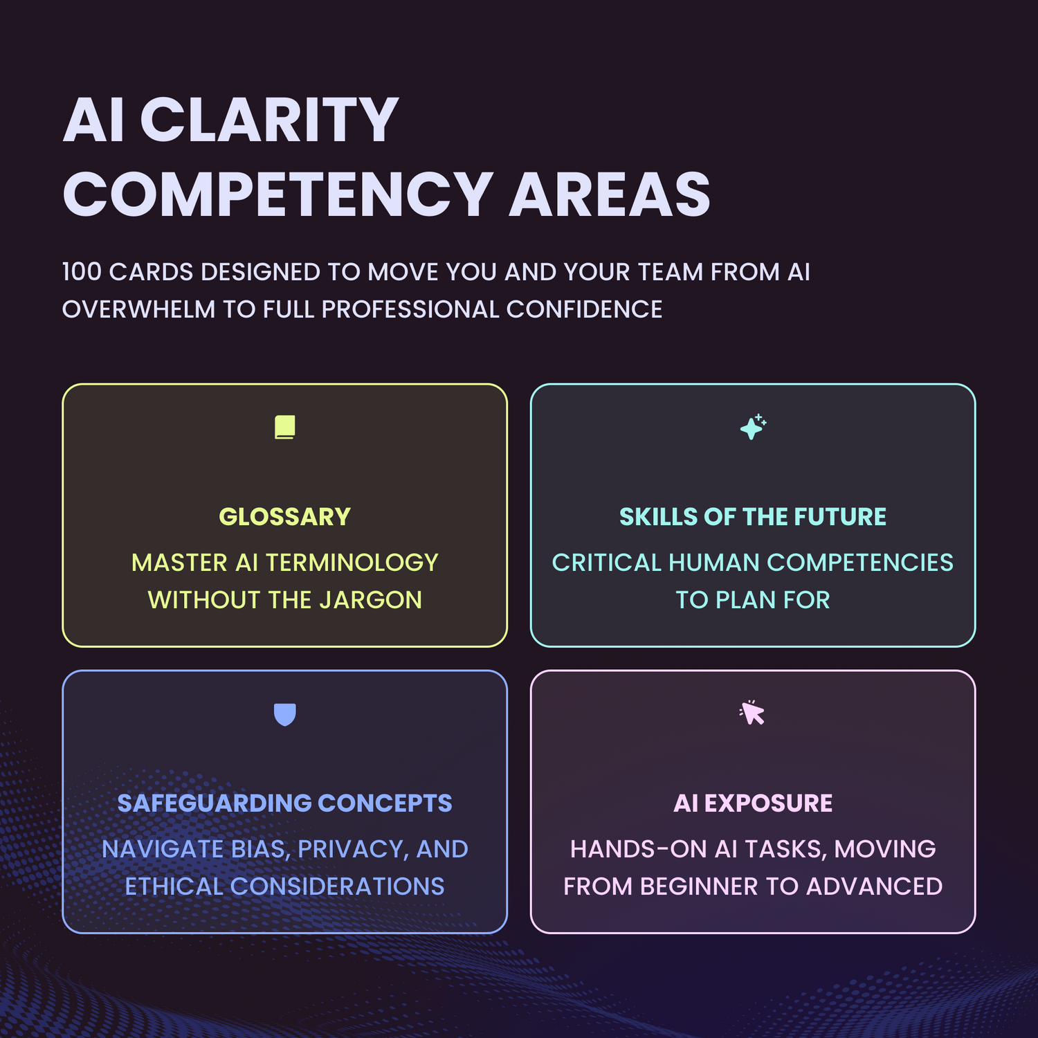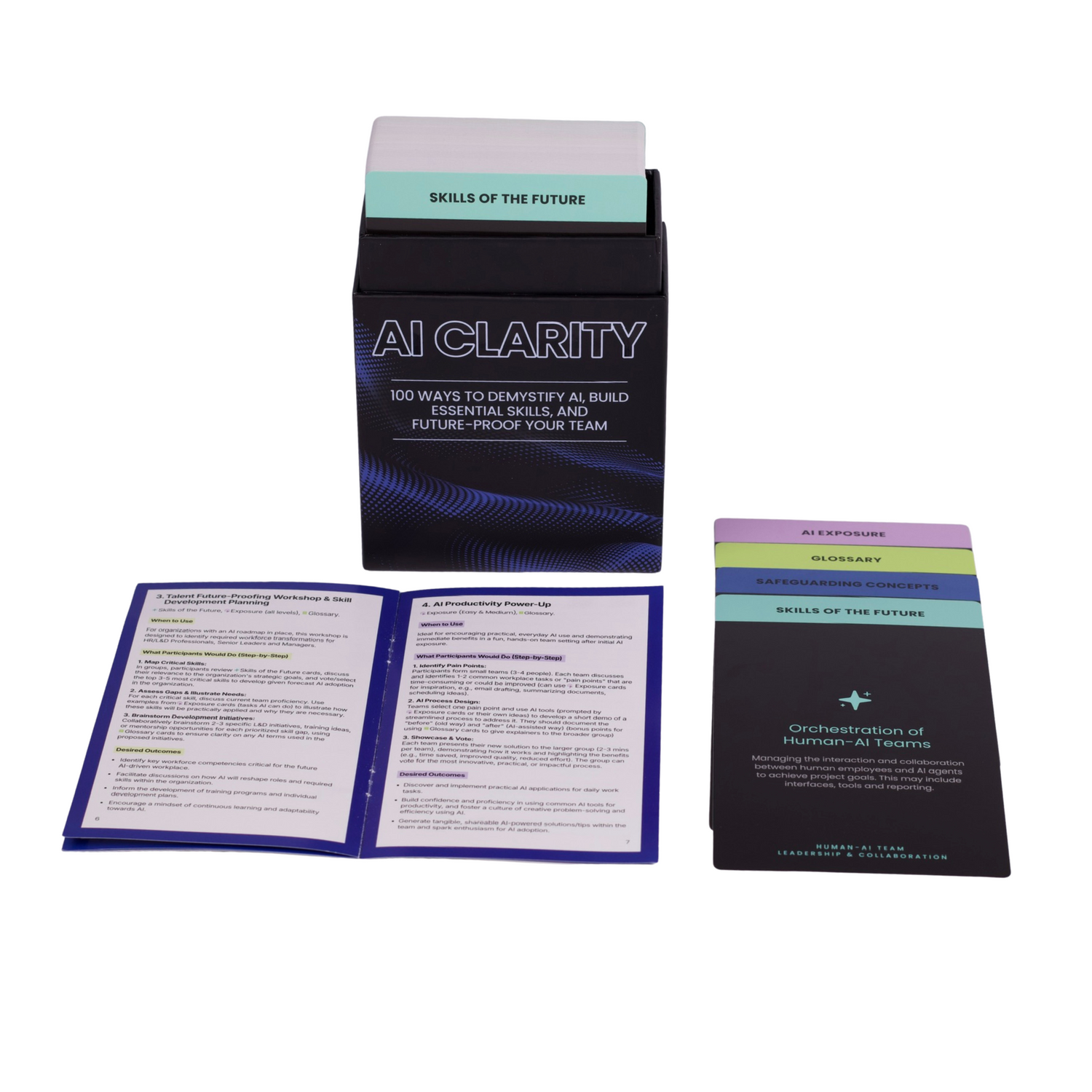 To help you get started, there are three pre-written complete facilitation packages available as part of AI Clarity. Written by AI expert facilitators specifically for use with this deck, each one contains PDF, Google Slides and PPT templates (which can be edited to add your branding) and a facilitator guide.