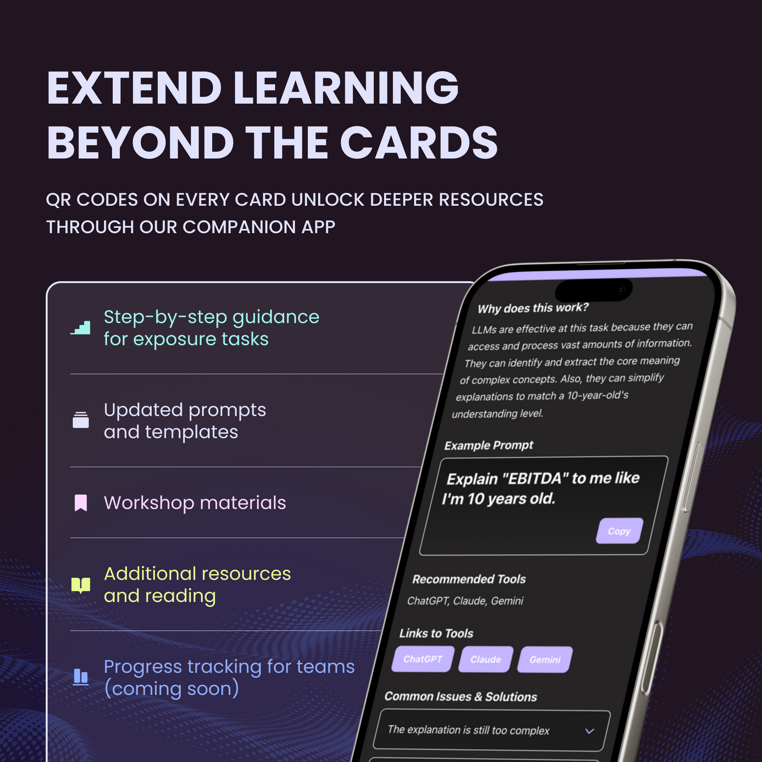 Each card features a QR code that opens in our companion app, ensuring your training materials stay current as AI evolves. The app provides copy-paste prompt templates, extended learning resources, cross-references between concepts, and search functionality to maximize your learning impact.