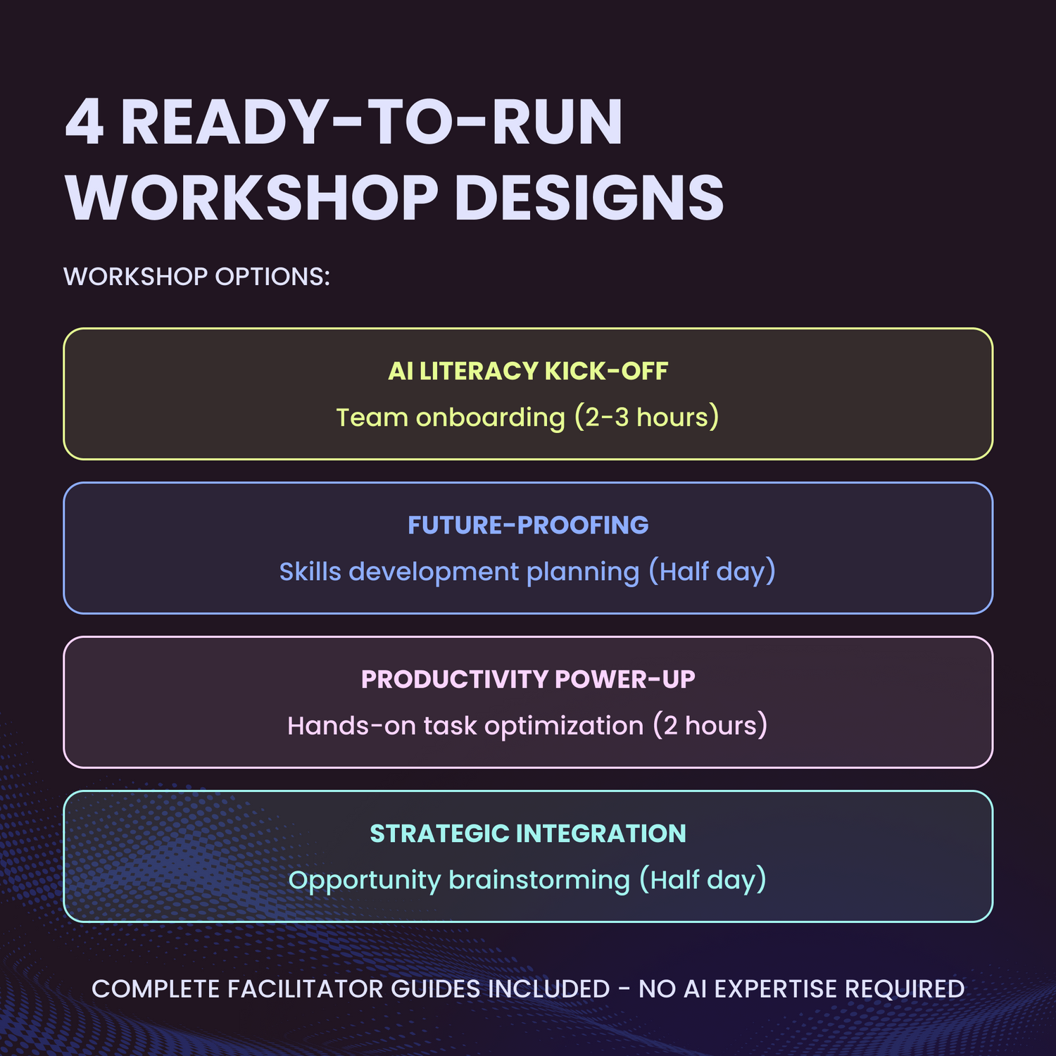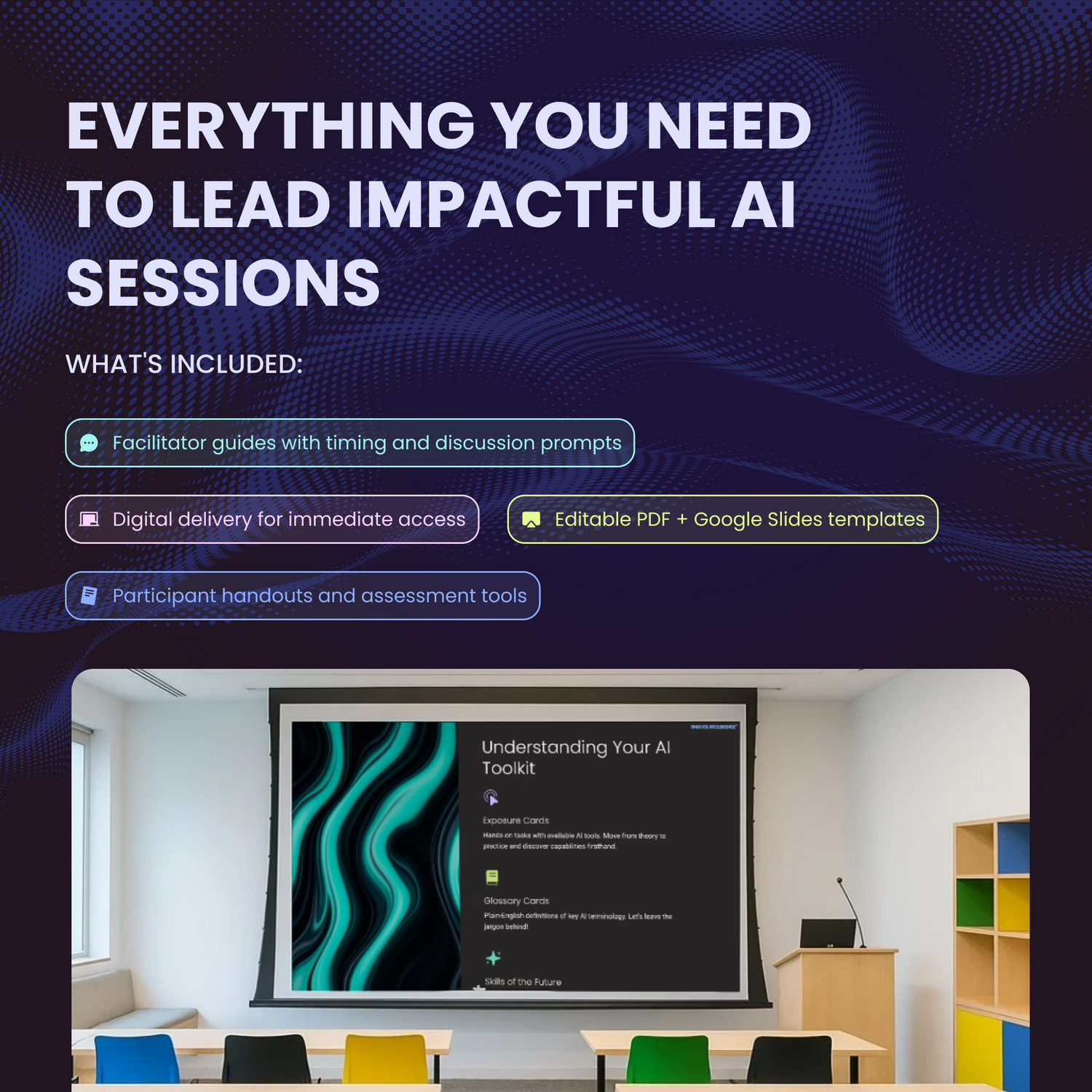 AI Clarity includes three complete workshop packages written by expert facilitators, each with ready-to-use PDF, Google Slides, and PowerPoint templates plus detailed facilitator guides. Choose from a 90-minute team introduction, strategic brainstorming sessions for leaders, or workforce development workshops – all fully customizable with your branding.