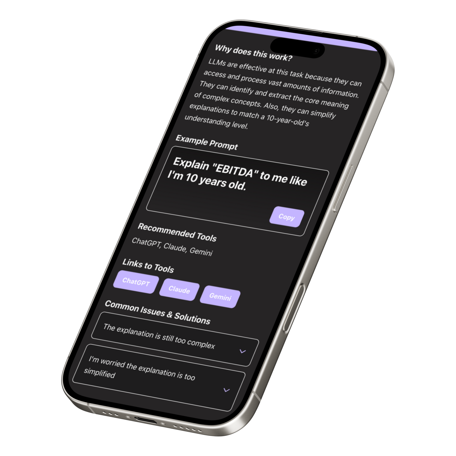 - Glossary Cards: Master AI terminology without the jargon - talk confidently about LLMs, APIs, RAG, and more